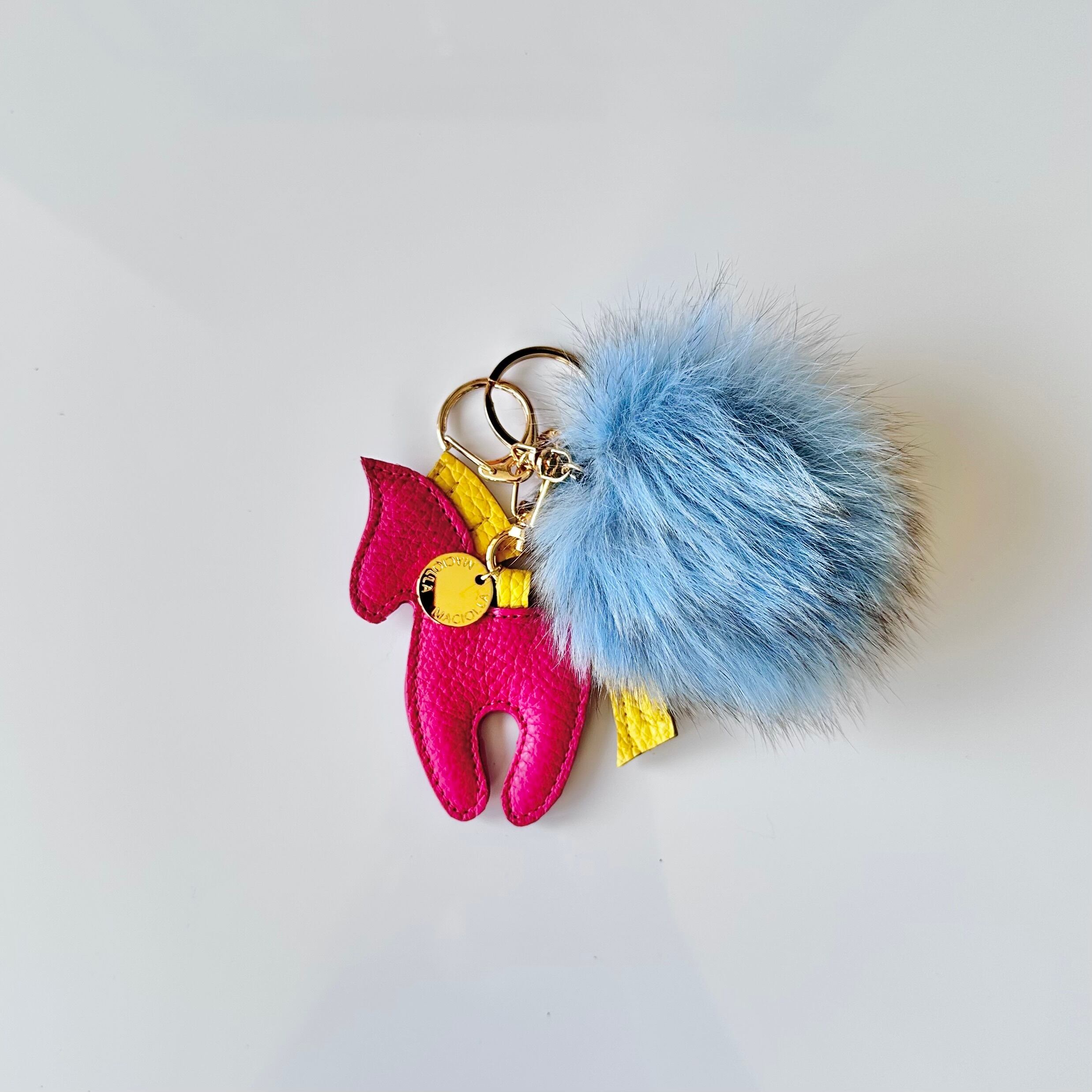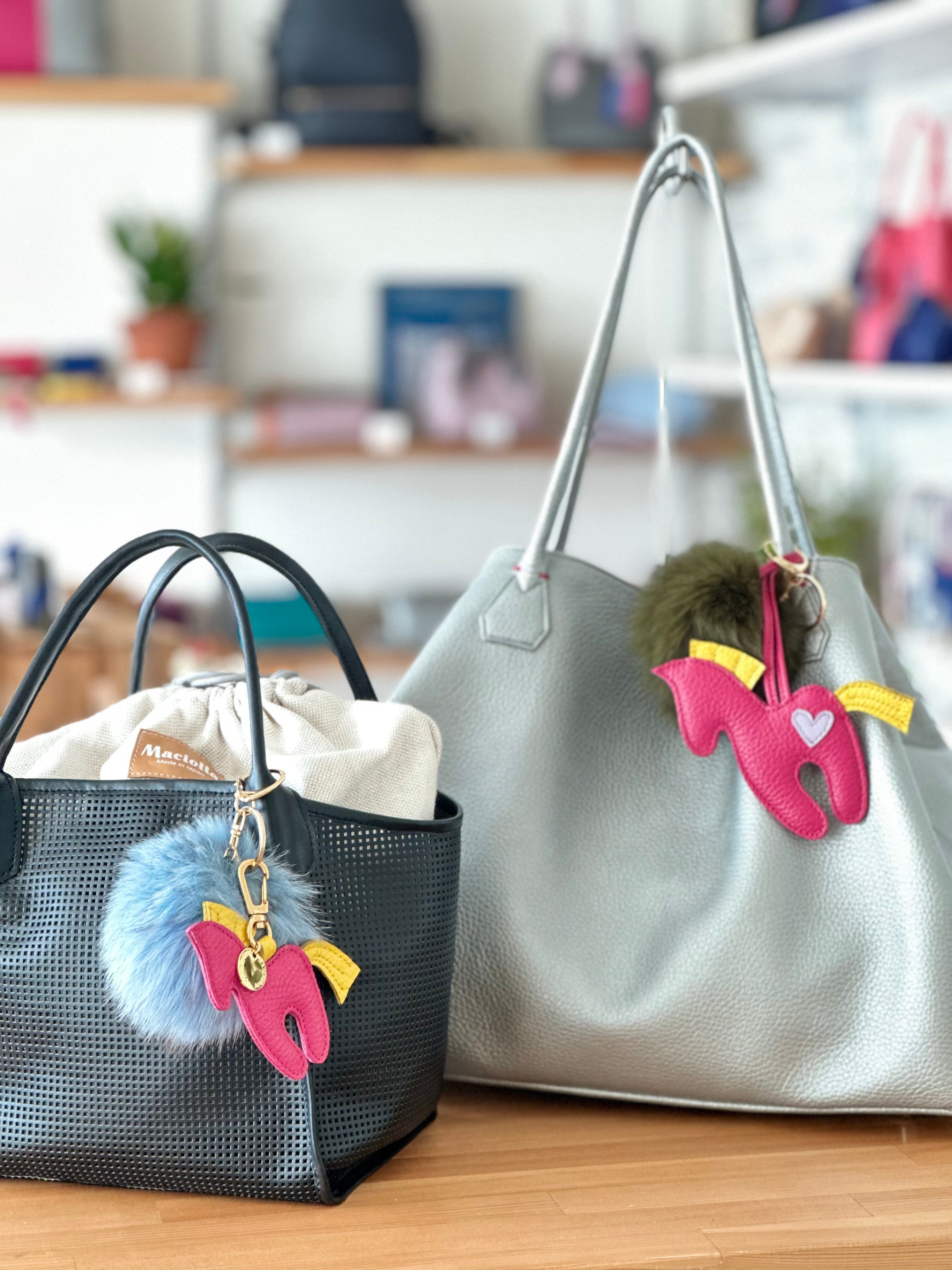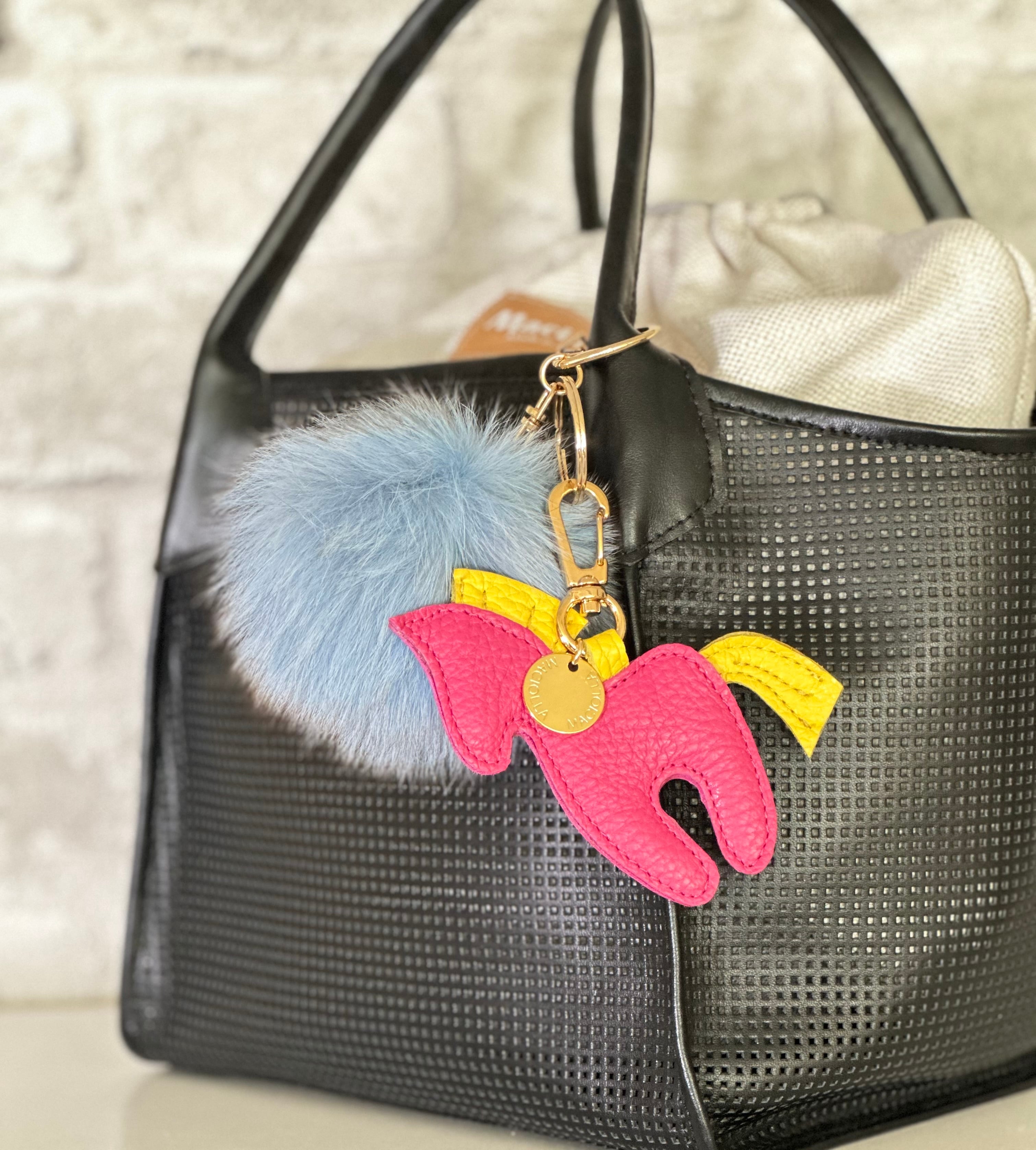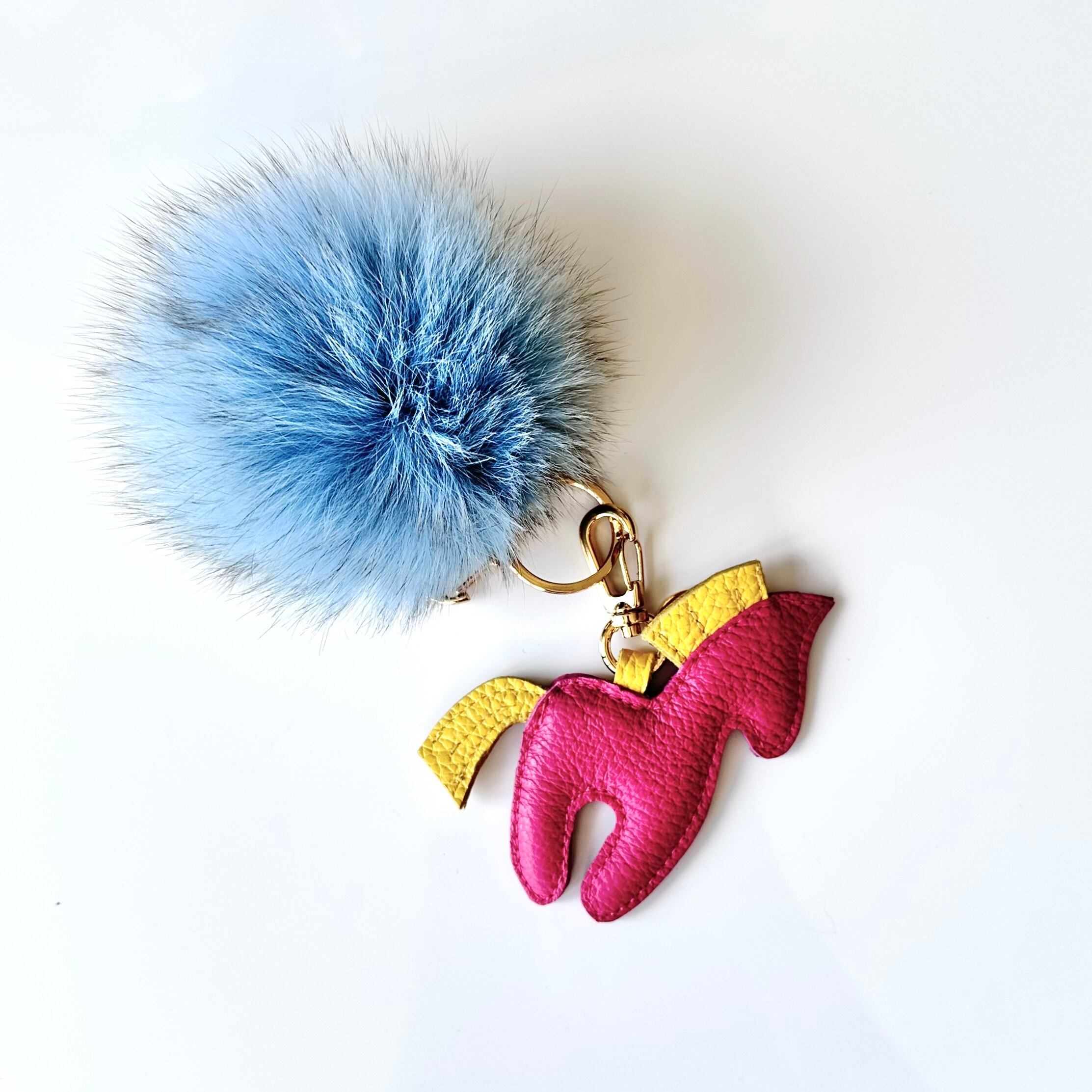 可愛いウマの形をしたバッグチャームとふわふわフォックスファスナーがついたキーホルダー。